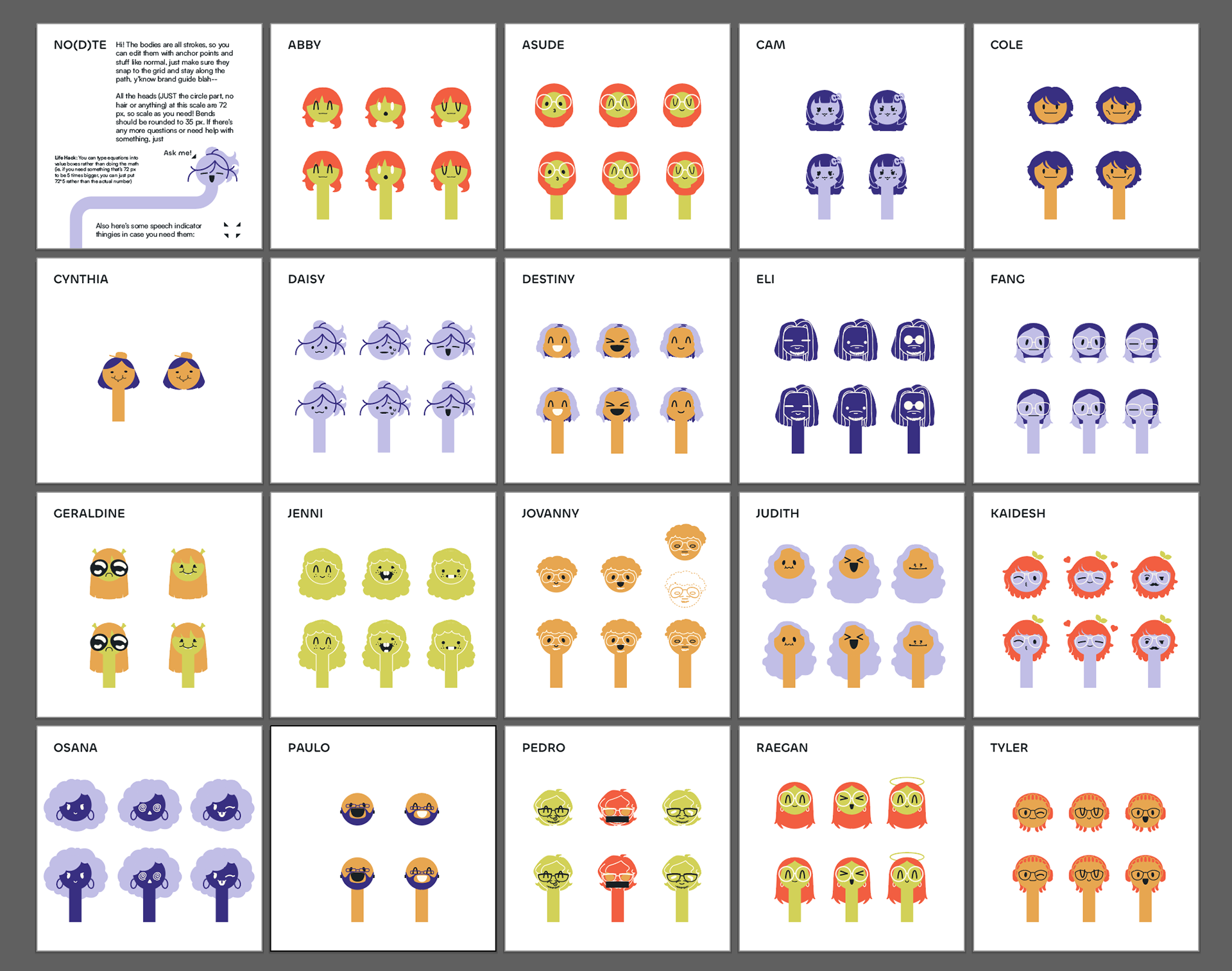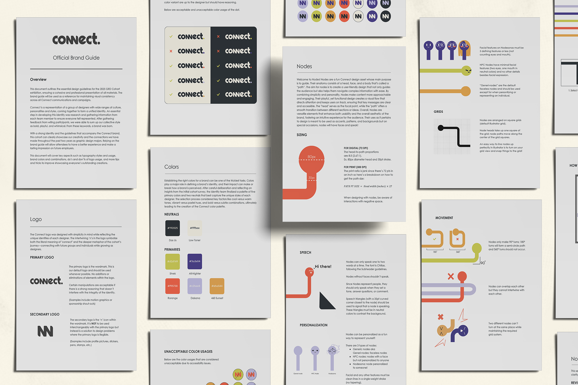 A significant element of our branding was the usage of nodes, namely "Nodesonas": branded personifications of everyone in our cohort. Keeping branding, visual style, and everyone's personal preferences in mind, I developed sets of expressions for everyone and made them into assets to use across digital and physical mediums for promotion and the exhibition.